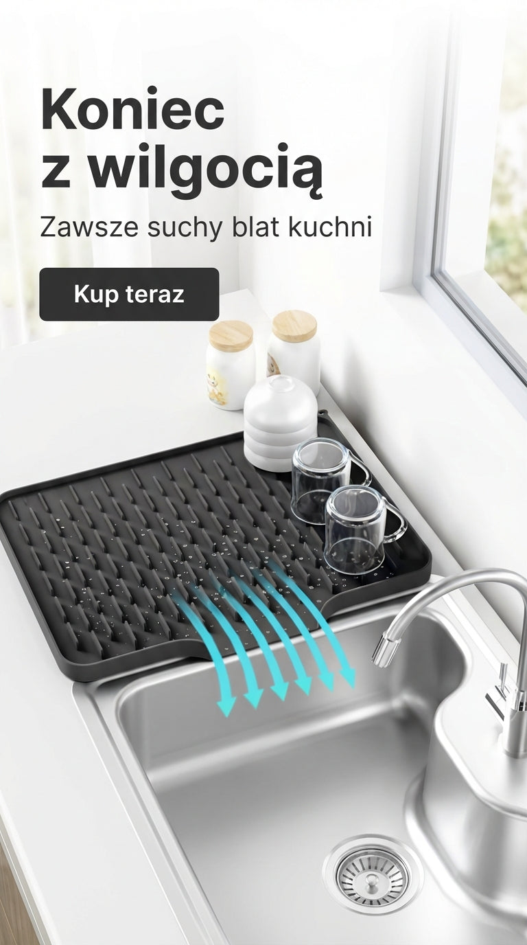 Zapomnij o wilgotnych ścierkach i zaciekach z kamienia. Nasza mata dzięki specjalnemu nachyleniu automatycznie kieruje wodę prosto do zlewu, zapewniając Ci czystość bez wysiłku.